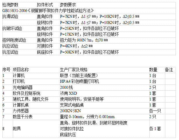 附具:配置:直角、旋轉(zhuǎn)扣件抗滑、抗破壞;扭轉(zhuǎn)剛度;對(duì)接扣件抗拉;底座抗壓各一套